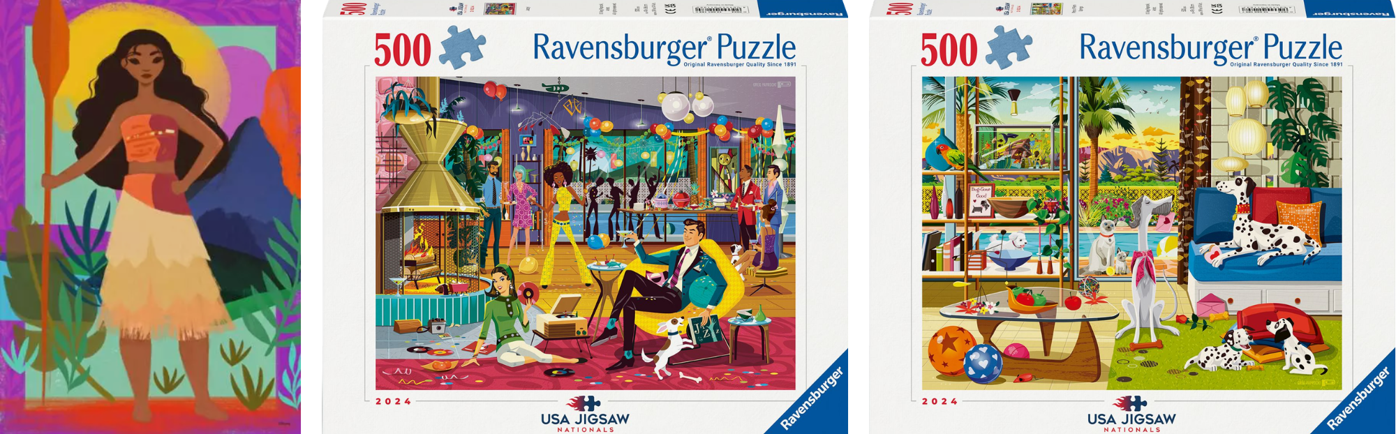 Fun illustrations. The best example I can give is the Mini Tourney speed puzzling event Moana puzzle. That style of artwork, illustration style, where there's just blocks of color or patterns, when there's good sections you can pull out, that's kind of my style. "Jazzy" from a few years ago, I really like and I did the other one that's by that same artist. Lots of things you can work with, lots of textures, lots of different sections.